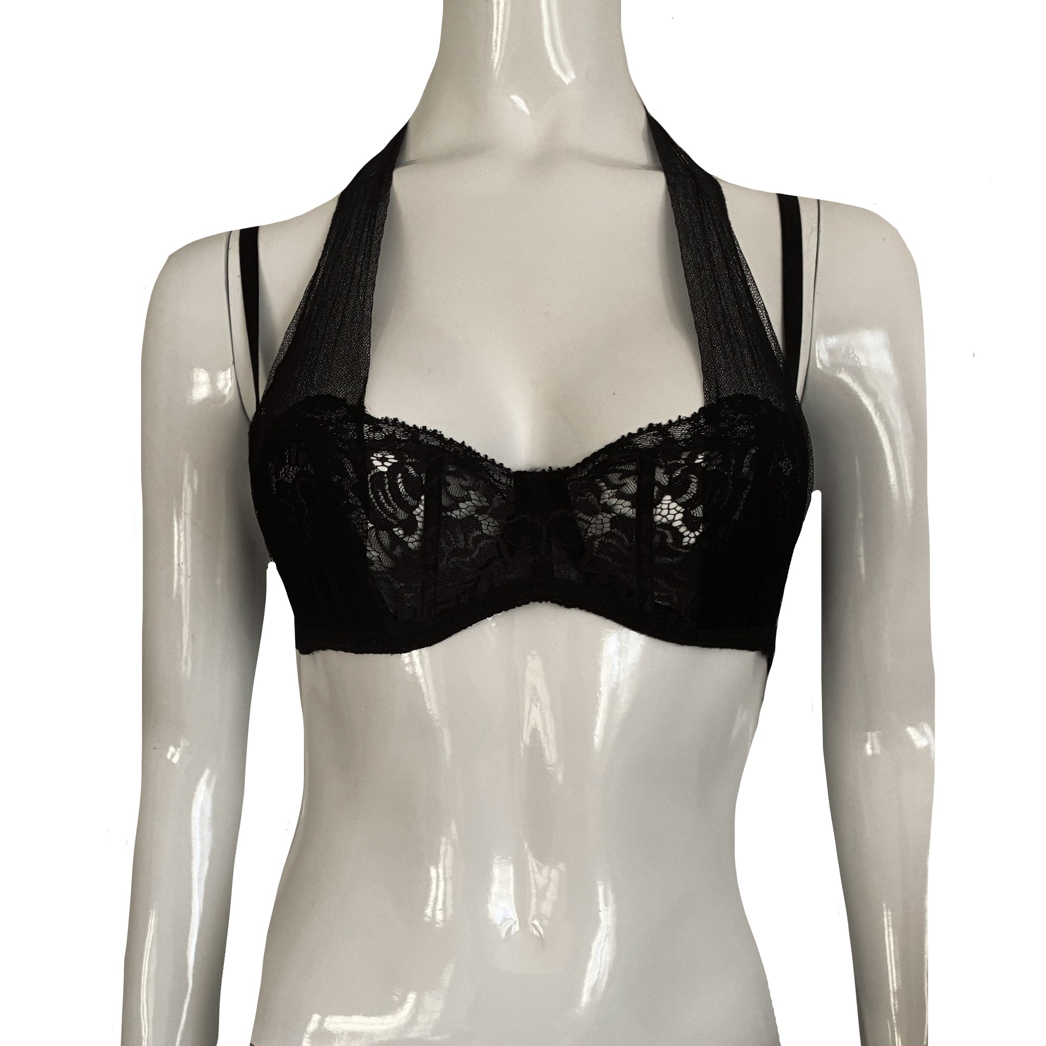 La Perla SS2014 sheer halter bra. Black lightweight construction with transparent mesh cups and lace trim. Structured underwire provides support while maintaining a minimal, refined silhouette.