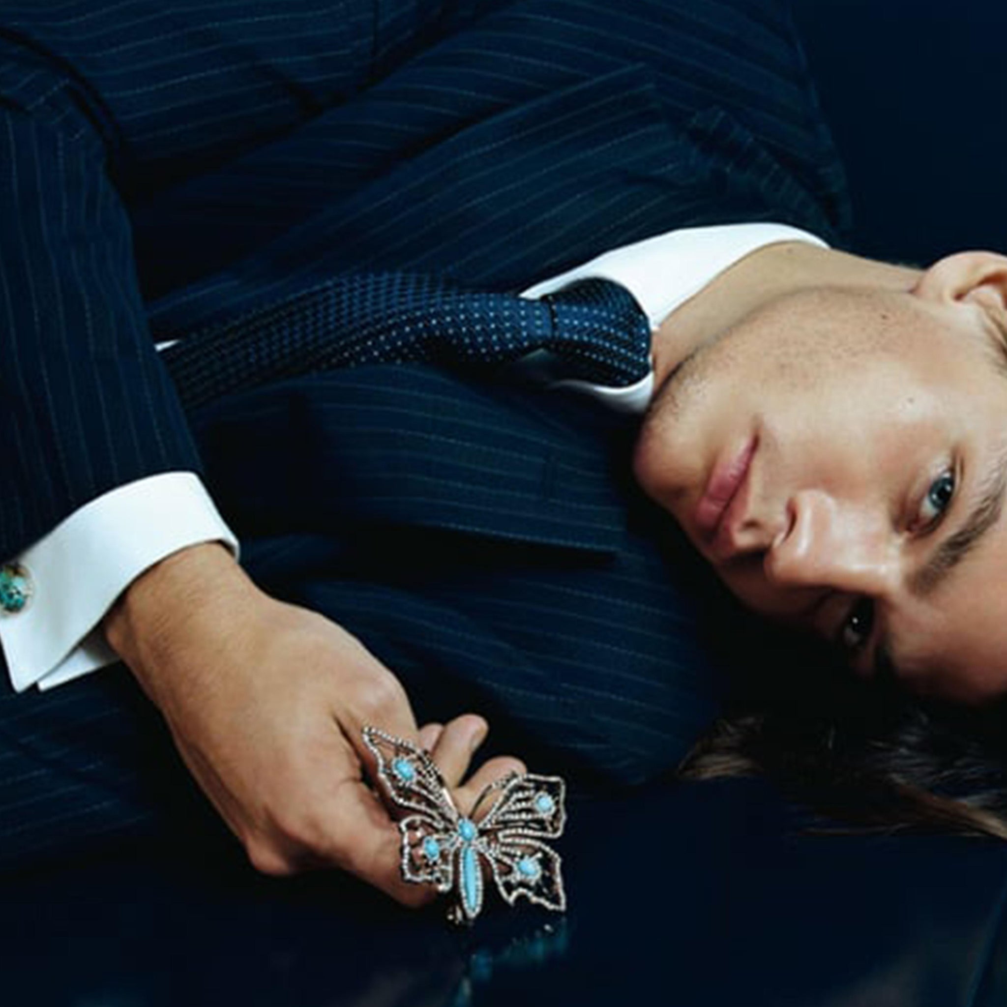 Defining feature of this model : pair of removable sculptural butterfly ornaments at the temples — motif that appeared throughout the SS2003 show as a signature accessory element.