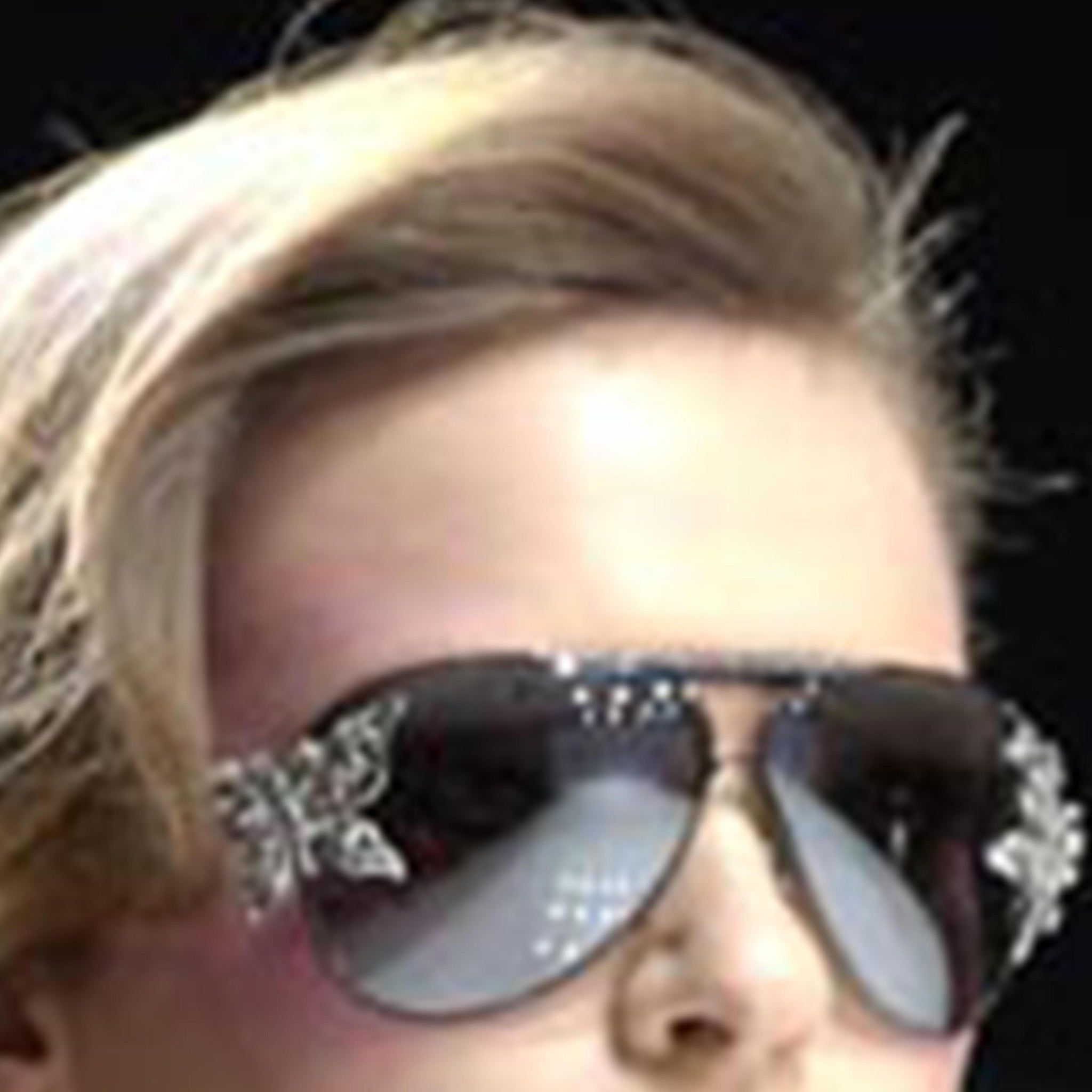 Sleek metallic blue aviator-style frame, accented with brilliant rhinestone detailing along the contours.